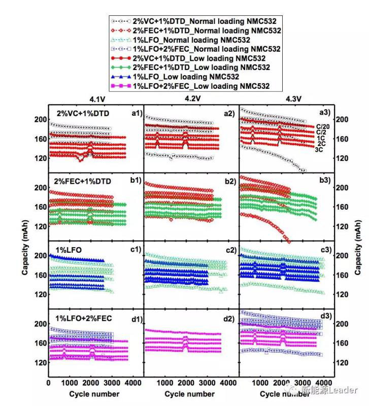 在上述電池循環(huán)過程中,作者每循環(huán)100次就對電池在C/20、C/2、1C、2C和3C倍率下的放電能力進行了測試(結果如下圖所示,每張圖片自上而下分別為C/20、C/2、1C、2C、3C的容量變化),從圖中能夠看到非涂層NCM523/石墨電池在4.3V下循環(huán)時3C放電容量衰降的非???,這其中采用2%FEC+1%DTD電解液的電池的3C放電容量的衰降速度要明顯快于2%VC+1%DTD的電池,而采用1%LFO電解液的電池的3C放電能力在經過4000次循環(huán)后仍然沒有非常顯著的衰降,這也表明了電解液添加劑的重要性。