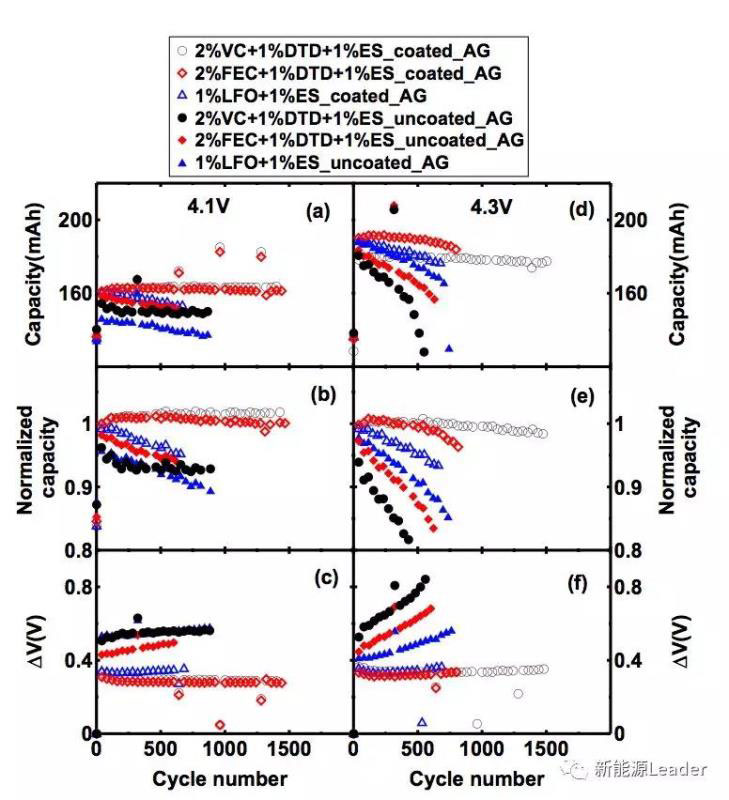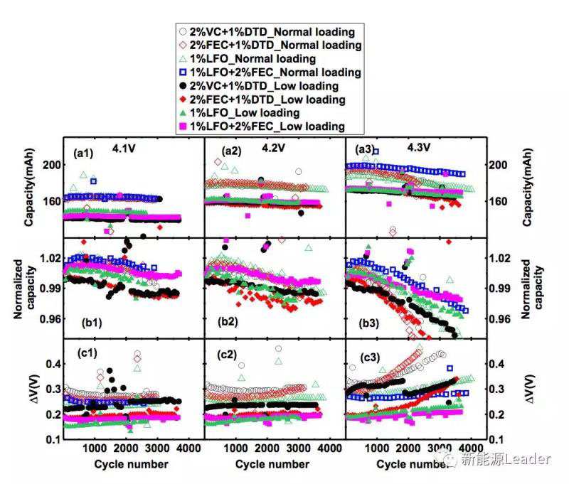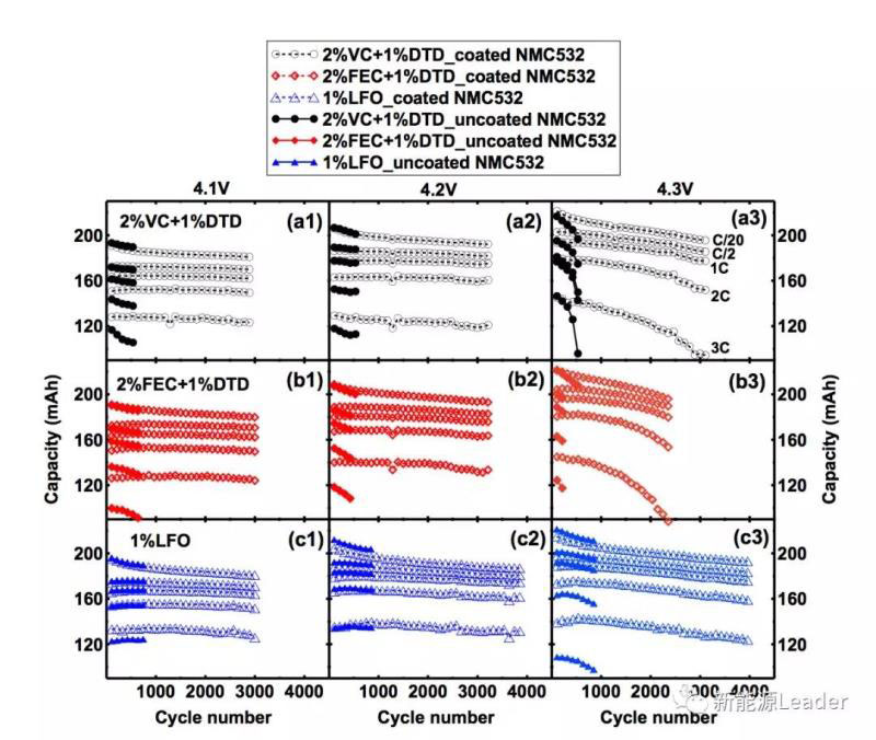 采用2%FEC+1%DTD的涂層NCM523電池在4.3V循環(huán)2000次后出現了容量跳水的現象,采用1%LFO電解液的非涂層NCM523電池在循環(huán)700次后出現容量跳水的現象,而采用2%VC+1%DTD電解液的涂層NCM523電池在4.3V循環(huán)2500次后出現容量跳水,采用1%LFO電解液的涂層NCM523電池在循環(huán)超過4000次后仍然沒有出現容量跳水的現象。
