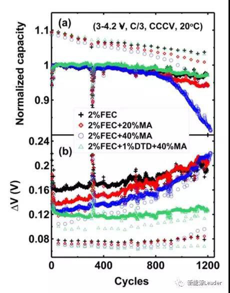 Xiaowei Ma的工作表明正極表面涂層能夠有效的減少電解液在正極表面的氧化分解,從而提升電池的循環(huán)性能,高截止電壓、不合適的電解液添加劑都會導致電解液在負極表面分解加速,從而引起鋰離子電池的容量跳水,此外降低涂布量、采用人造石墨、提高LiPF6的濃度也能夠有效的改善電池的循環(huán)性能。