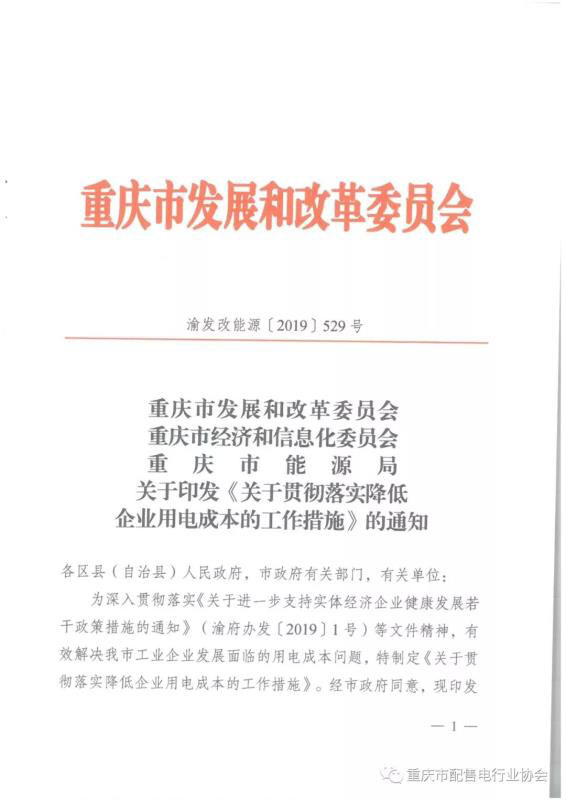 2019年4月28日,重慶市發(fā)改委、經(jīng)信委、能源局聯(lián)合印發(fā)了《關(guān)于貫徹落實(shí)降低企業(yè)用電成本的工作措施》(渝發(fā)改能源 [2019]529號,以下簡稱工作措施)的通知。該文件是落實(shí)重慶市政府一號文《關(guān)于進(jìn)一步支持實(shí)體經(jīng)濟(jì)企業(yè)健康發(fā)展若干政策措施》(渝府辦[2019]1號)的配套舉措。根據(jù)渝府辦[2019]1號的要求,從發(fā)電、輸配、政府基金及附加、用戶四端共同發(fā)力,將產(chǎn)品有市場的重點(diǎn)工業(yè)企業(yè)用電價(jià)格降低到0.6元/千瓦時左右?!豆ぷ鞔胧吩诖吮尘跋鲁雠_,強(qiáng)調(diào)了通過市場機(jī)制降低工商企業(yè)用電成本。注意到,文中強(qiáng)調(diào)的“成本”包含但并不局限于用電“價(jià)格”,而是從資產(chǎn)管理、優(yōu)化運(yùn)營、用戶服務(wù)等多維度為企業(yè)減負(fù),提升企業(yè)獲得感。