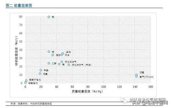 同其他燃料相比,氫的最大優(yōu)勢是超高的質(zhì)量能量密度和可接受的體積能量密度(需壓縮氫氣或液化),常見燃料能量密度如表二所示: