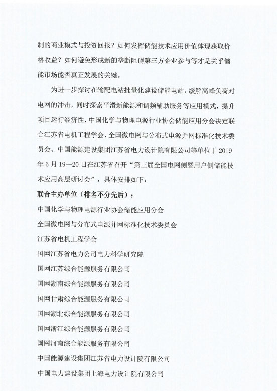 關(guān)于召開第三屆全國電網(wǎng)側(cè)暨用戶側(cè)儲(chǔ)能技術(shù)應(yīng)用高層研討會(huì)的通知