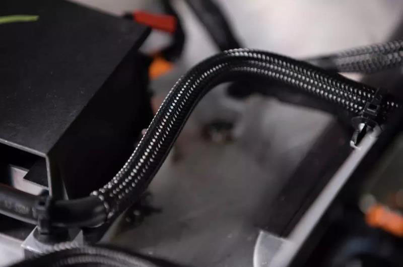 另外,整個(gè)電池包內(nèi)的大部分管線都采用了尼龍網(wǎng)狀編制管套,特別是與電池包殼體及內(nèi)部器件接觸的管線,在保護(hù)線束,避免磨損的同時(shí),也起到降低噪音的作用。