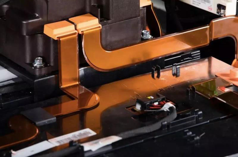 另外,高壓電器的連接也是整個(gè)電池包組裝中最核心最關(guān)鍵的一點(diǎn),尤其是在主回路連接的可靠性和低內(nèi)阻設(shè)計(jì)上。比亞迪的電池包在主回路的長距離連接上采用了耐高溫的聚酰亞胺壓封的銅排,并且設(shè)計(jì)了很多立體彎折,從而在受到振動(dòng),或是受熱膨脹時(shí),通過這些彎折來吸收長度的變化,避免將載荷轉(zhuǎn)移到連接螺釘上。
