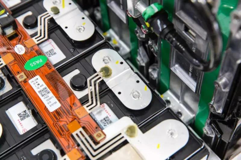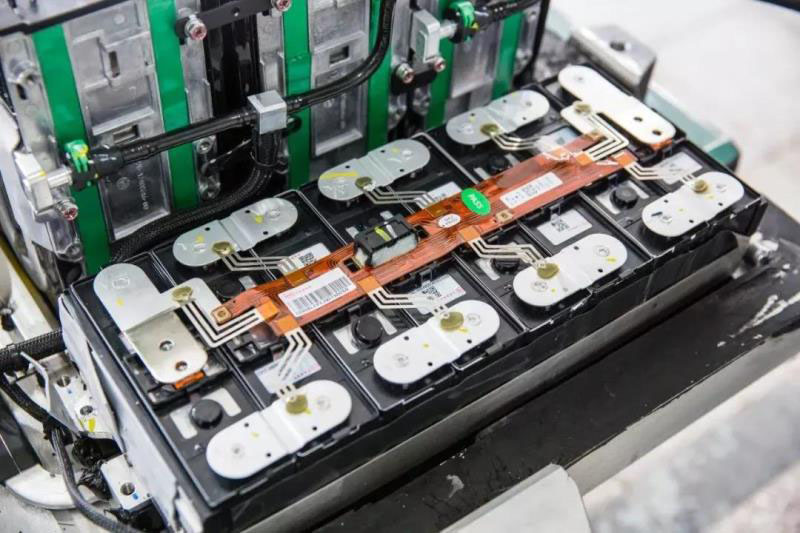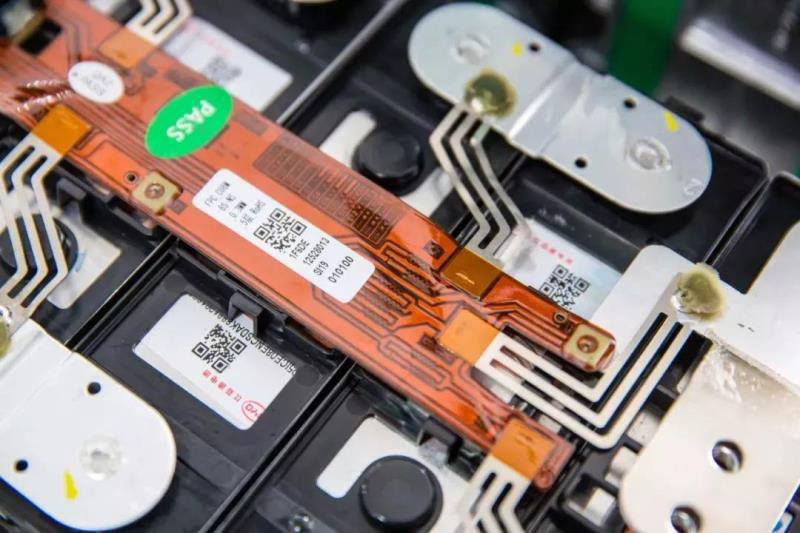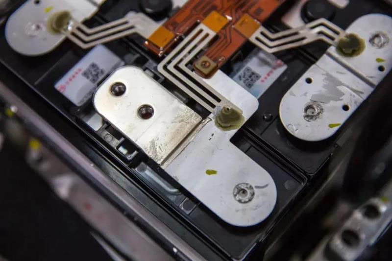 在信號(hào)連接的部分,比亞迪采用了柔性電路板,相對(duì)于傳統(tǒng)采樣線束的方案,集成度更高,也更輕薄。如果仔細(xì)觀察,會(huì)發(fā)現(xiàn)柔性電路板上有細(xì)絲狀的布線,我們稱之為采樣線熔斷線。它的作用是在碰撞時(shí),可能會(huì)擠壓采樣線束造成短路,進(jìn)而引起采樣線起火,這些細(xì)絲便會(huì)在短路時(shí)由于過流而發(fā)生熔斷,從而切斷短路回路,確保整個(gè)線束的安全和電池模塊的安全。