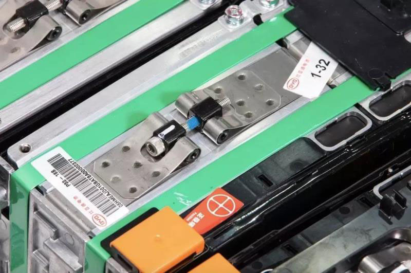 雖然從接觸內(nèi)阻的角度來講,單螺釘?shù)慕佑|內(nèi)阻就滿足發(fā)熱要求。但比亞迪依然堅(jiān)持用雙螺釘?shù)脑O(shè)計(jì)方案,從而大幅提高可靠性。而且在螺釘?shù)臄Q緊確認(rèn)上,我們發(fā)現(xiàn)有三種顏色的色標(biāo),這意味著進(jìn)行了三遍確認(rèn)。第一遍為自動(dòng)擰緊軸擰緊,并打上紅色標(biāo)記,后兩遍為人工利用扭矩扳手復(fù)檢,分別打上黃色和白色標(biāo)記。