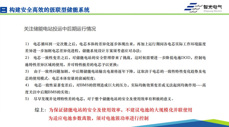 另外,我們所有的單體,大家一致性做的再好,但是還是會有差異,在運行的過程中總是會離散,特也是在它的首端和末端,性能會離散的。為了保持我們的一致性,所以我們?yōu)槭裁匆タ刂艱OD,在這個方面也是有其中的一些因素在里。當我們并聯(lián)的電池越多的時候,我們這個DOD的范圍是不是要縮小,我們運行在初期的時候,比如我們DOD是90%,當然這個90%我這里要說明一下,在最近我們一些標準里頭,大家指定的對SOC的定義,它的分母變量是一個變化的,當然我的分析是在于我們能不能用一個分母不變的數(shù)據(jù)來對電池的可用容量、對電池使用的容量來進行定義,如果說在這種定義的情況下,就意味著當我們電池使用連線增加了以后,我們是要去縮短,我們可能要去控制可用容量的,就是說我們是不是要去把我們BMS電壓范圍,特別是并聯(lián)到一起以后,當我們掌握不了每一個電芯實際的情況的時候,在運行的中后期,比如運行2年、3年以后,我們要不要把保護的電壓范圍縮窄,為了安全我們要不要去縮窄,這個是我們要去考慮的。再有一個,當我們把大量的電芯并聯(lián)到一起以后,它可能會帶來一些功率分配上的問題、電流分配上的問題,它可能會不均衡。這些就會導致我們整個電池的不可控性會增加。所以我們就主張要做小容量的電池包來解決這個問題。