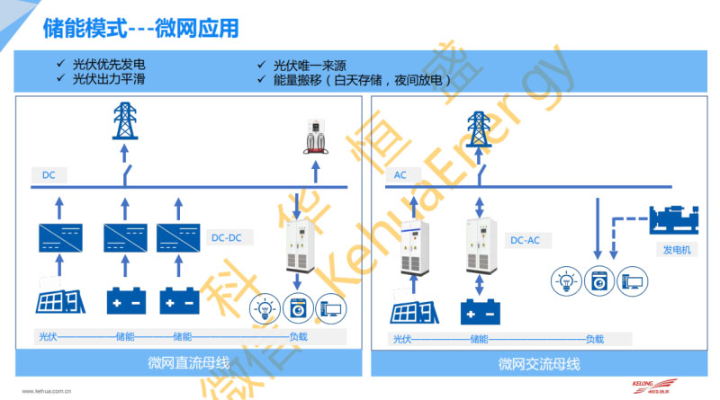 這是我們在離網(wǎng)這一塊的內(nèi)容。另外談到微網(wǎng)應(yīng)用,其實(shí)在微網(wǎng)應(yīng)用有兩種模式,一種是DC方案,一種是AC方案。各有優(yōu)勢和劣勢。比如說交流方案,從直流方案來看,它的好處是直流相比來說接入點(diǎn)不一樣。它接入的直流是有一個(gè)電壓,正負(fù)極的區(qū)別。但是交流不一樣。從整個(gè)的結(jié)構(gòu)來看,直流又存在另外一個(gè)問題。因?yàn)橹绷鞯谋Wo(hù),本身技術(shù)沒有零點(diǎn),保護(hù)措施是有差異的。第二個(gè)問題在于大、微電網(wǎng)。微電網(wǎng)和大電網(wǎng)的區(qū)別就是小跟大的區(qū)別。小的情況下,可以看一下這邊做的微電網(wǎng),核心點(diǎn)全部是電力電子器件,沒有所謂的發(fā)電機(jī)。這種情況下我們都知道,電力電子產(chǎn)品的特性完全不一樣。做電力穩(wěn)定的時(shí)候,考慮的不光是靠EMS可以搞定的,是靠器件的本身。直流有一個(gè)好處,其實(shí)像電池是不需要轉(zhuǎn)換的。這個(gè)時(shí)候你的尺寸就會(huì)做得很大。但是還有缺陷。缺陷在于我們直流這一塊的保護(hù)傳輸。相比交流的傳輸是有一定瓶頸的。