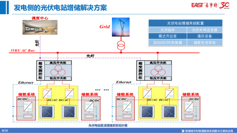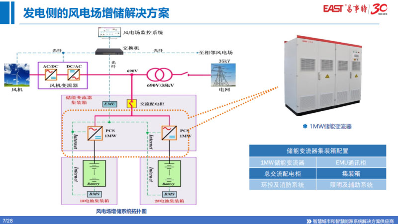 首先是關(guān)于發(fā)電側(cè)的解決方案,這是風(fēng)電場增儲的解決方案。風(fēng)電場特殊的電壓等級決定了增儲系統(tǒng)的核心是1MW儲能變流器,我們這么多年從光伏一直走過來,技術(shù)積累是足夠的,所以風(fēng)電場增儲的解決方案中我們主推自己研發(fā)的1MW儲能變流器,這是我們的優(yōu)勢。其次是光伏電站增儲解決方案,我們解決了很多相關(guān)核心問題,例如對直流母線電壓的穩(wěn)定性控制問題以及對組件的MPPT追蹤問題,包括我們怎么去控制輸出功率以及整個組件追蹤策略,以及到底怎么配合AGC調(diào)度系統(tǒng)的運行等。這是我們做的一些相關(guān)的工程實驗,是可以完全達到所需要的效果。另外,我們基于這個解決方案的平臺還推出了離網(wǎng)微電網(wǎng)的解決方案,應(yīng)用到海外的微電網(wǎng)項目中這是我們在西北做的光伏電站增儲項目,效果還是比較明顯的。