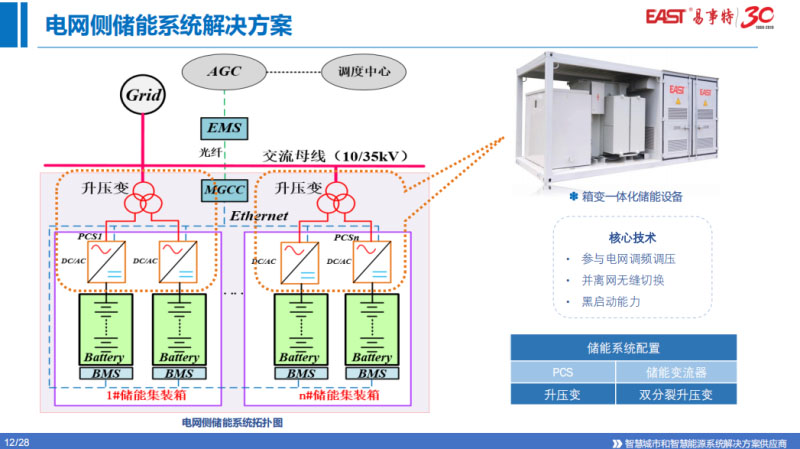 第二部分是關(guān)于電網(wǎng)側(cè)儲能的解決方案,一個是電氣,核心設(shè)備相關(guān)核心技術(shù)的研究,包括黑啟動、并離網(wǎng)無縫切換,第二個是關(guān)于設(shè)備跟電網(wǎng)的通訊調(diào)度控制的方案。這是我們做的一些相關(guān)的工程實驗波形,解決了一大堆調(diào)壓調(diào)頻還有黑啟動等核心關(guān)鍵技術(shù)問題,。這是去年11月份的儲能項目,我們第一批參與這個項目的企業(yè)。這里頭,背景是國家能源局批復(fù)的首個電池儲能試驗示范項目,這方面我們具備所有的技術(shù)核心開拓的能力。
