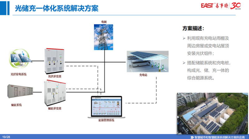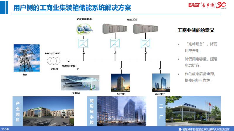 第三是關(guān)于用戶側(cè)的,這個就探討得比較多。我記得去年年上半年的時候,用戶儲能的項目的建設(shè)是一波高過一波。但是今年上半年整體市場反應(yīng)是非常冷淡的。也就是說今年用戶側(cè)項目趨于保守,至于原因是什么,我覺得有好多深層次的問題。我們?nèi)ツ曜隽舜罅康挠脩魝?cè)儲能項目,包括在江蘇、鎮(zhèn)江做了很多精品工程包括浙江衛(wèi)視都去現(xiàn)場采訪過。這是相對來講比較簡單的一種系統(tǒng)解決方案,門檻低,整個模式和測算都是相對固定,風(fēng)險比較小,整體解決方案無非這么幾個,按照相關(guān)的控制策略去充去放等而已。在南方地區(qū),這是和廣州供電局做的一個儲能成套裝置采購項目。它既可以作為獨立電源使用,又可以跟配網(wǎng)互動,在用電低谷時充電,用電高峰時放電,削峰填谷、提高電能質(zhì)量、緩解用電高峰期供電壓力。這是我們最近在交付的廣州發(fā)展集團的光儲項目。在已有光伏發(fā)電系統(tǒng)上增儲,著力打造光儲一體化系統(tǒng),解決棄光問題,提高新能源消納率,以及平滑光伏系統(tǒng)功率波動,提升電能輸出質(zhì)量。