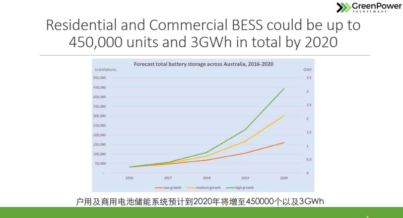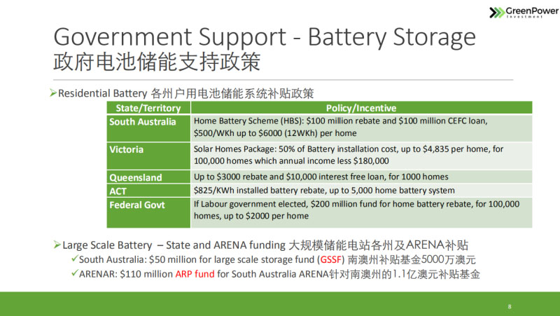 澳大利亞是全球儲能市場增長最快的國家之一,前幾名是美國、澳大利亞、德國、中國、日本,可是你要想澳大利亞人口有多少呢?2400萬,它的增長速度在2017年比美國差不了多少,或者相同。這意味著什么呢?澳大利亞在增長速度上面最快的,至少在2017年這樣,美國有3個多億的人口,據(jù)統(tǒng)計,現(xiàn)在大約在澳洲有55個Agoing(音)的下面加在一起是4個,據(jù)統(tǒng)計也就是2年,它的這個總數(shù)會,綠色的就是最好,橘色的就是最低,如果是中國2020年增加到45萬個。澳大利亞自從《巴黎氣候協(xié)議》在2015年簽署以后,澳洲政府堅定不移的承諾和執(zhí)行氣候變化的這個協(xié)議,政府瞄準到2030年要實現(xiàn)50%的可再生能源,這是澳大利亞的各省的主要政策,各省跟聯(lián)邦政府也可能不是一個黨,聯(lián)邦政府是一個黨,每個省還有每個黨,有兩大黨,也不知道哪個省是哪個黨領(lǐng)導(dǎo)的,每個黨有不同的政策,所以我們這個橘黃色的是比較獨特的一個洲,他現(xiàn)在已經(jīng)沒有了,現(xiàn)在已經(jīng)實現(xiàn)了50%可再生能源的應(yīng)用,瞄準在2050年實現(xiàn)全部的零排放。澳洲政府對這個綠色能源的支持是非常有效的,也是實質(zhì)性的,在光伏方面把這個不同的項目分成兩大檔次,100千瓦為界限,大于100千瓦是大項目,小于100千瓦是小項目。補貼方式也不一樣,具體數(shù)字不一一說了,時間關(guān)系。