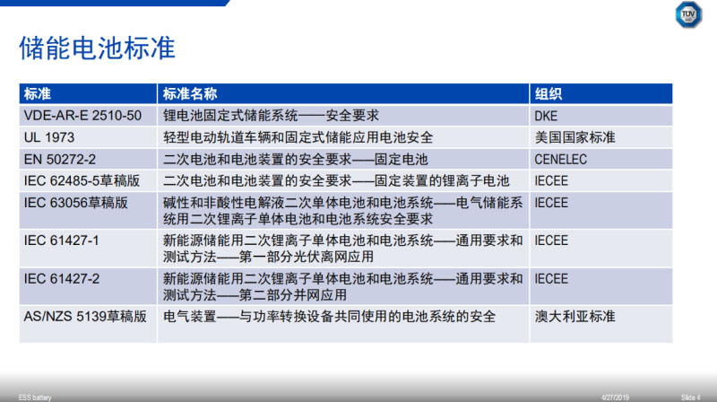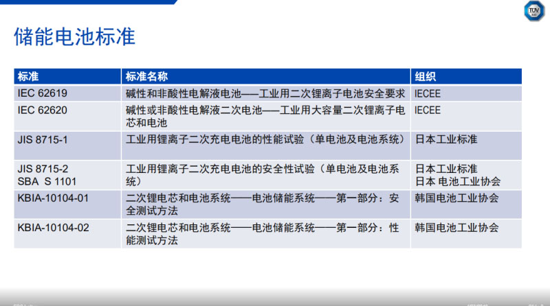 在2018年可以說韓國的儲能電池市場火了,怎么火了?有兩方面的含義,剛剛田女士給大家展示過韓國的儲能電池份額在全球不是很高,但是去年韓國儲能電站有報道的火災(zāi)就有16起,韓國大概有1000多座儲能電站,那么平均不到100個電站就發(fā)生一次火災(zāi)。這說明什么問題呢?儲能電池的風(fēng)險還是非常大。如何降低儲能電池的風(fēng)險呢?事實上鋰離子儲能電池發(fā)展的歷史并不長,但是各種國際標準、國家標準和行業(yè)標準還是不少的,例如IEC 62619,JIS 8715-2,UL 1973和VDE 2510-50等。