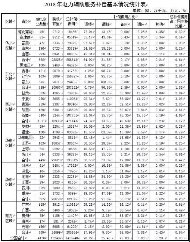 附件:2018年電力輔助服務(wù)補(bǔ)償基本情況統(tǒng)計(jì)表