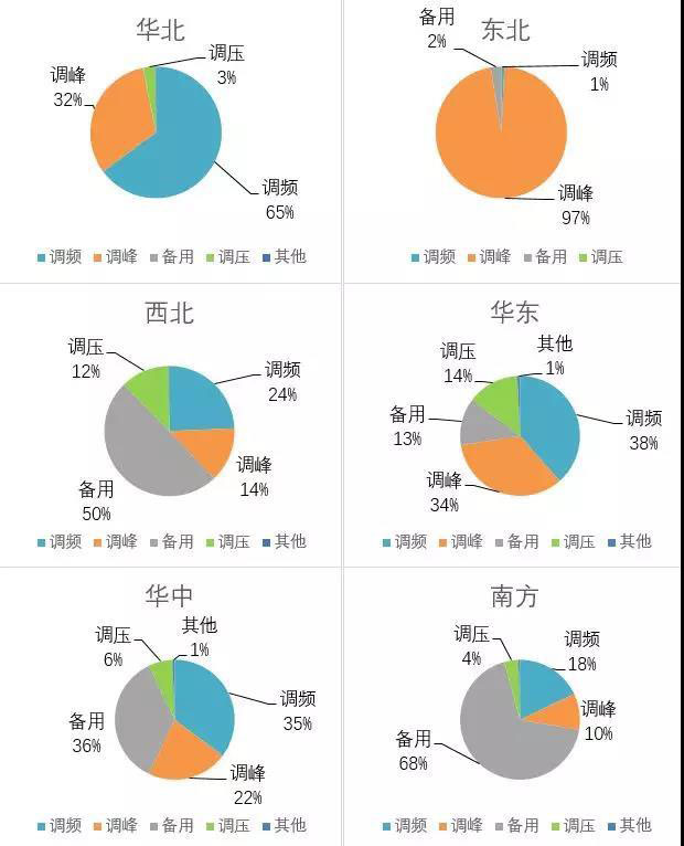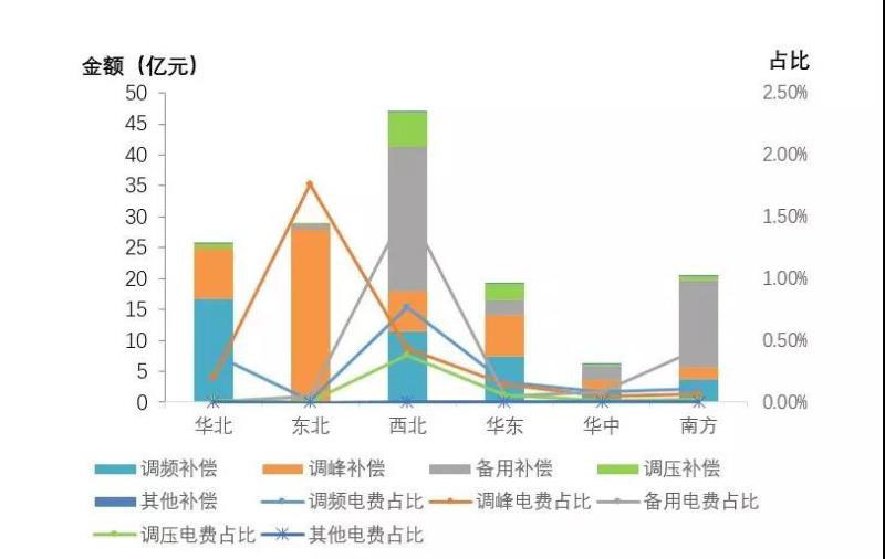 從分項(xiàng)電力輔助服務(wù)補(bǔ)償費(fèi)用來(lái)看,調(diào)峰、調(diào)頻和備用補(bǔ)償費(fèi)用占總補(bǔ)償費(fèi)用的90%以上。其中,東北、西北區(qū)域調(diào)峰補(bǔ)償力度最大,西北、華北區(qū)域調(diào)頻補(bǔ)償力度最大,西北、南方區(qū)域備用補(bǔ)償力度最大??傮w來(lái)看,西北區(qū)域整體電力輔助服務(wù)補(bǔ)償力度最大(見(jiàn)圖3)。