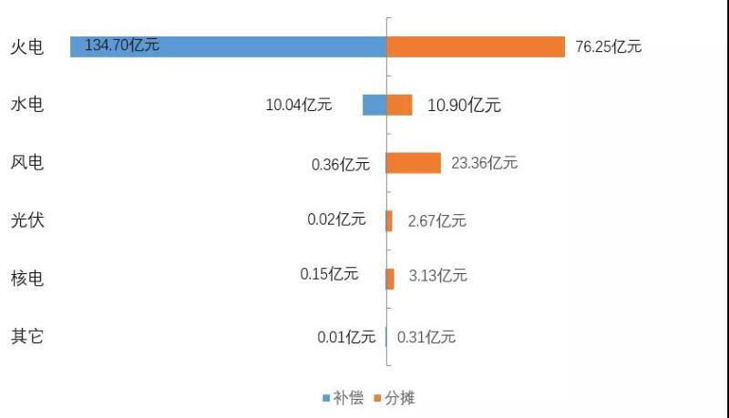 從能源類型的角度來(lái)看,電力輔助服務(wù)補(bǔ)償費(fèi)用的補(bǔ)償與分?jǐn)傎M(fèi)用對(duì)比如下(見(jiàn)圖5)。