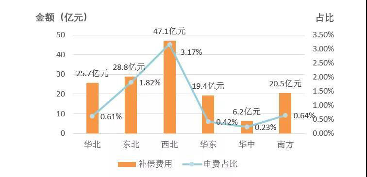 從電力輔助服務(wù)補(bǔ)償總費(fèi)用來(lái)看,補(bǔ)償費(fèi)用最高的三個(gè)區(qū)域依次為西北、東北和華北區(qū)域,西北區(qū)域電力輔助服務(wù)補(bǔ)償費(fèi)用占上網(wǎng)電費(fèi)總額比重最高,為3.17%,華中區(qū)域占比最低,為0.23%(見(jiàn)圖1)。