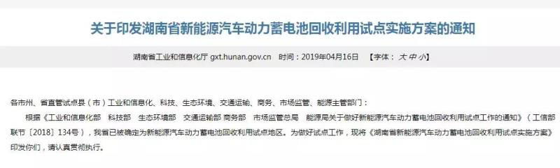 為加快推進新能源汽車動力蓄電池回收利用試點工作,構建新能源汽車動力蓄電池回收利用體系,近日,湖南省發(fā)布了《關于印發(fā)湖南省新能源汽車動力蓄電池回收利用試點實施方案的通知》。