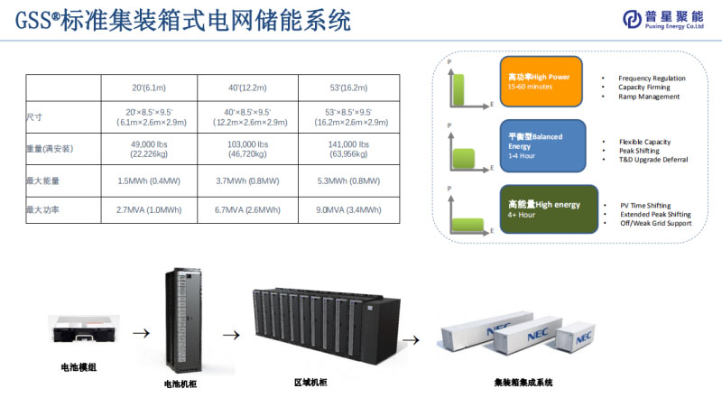 為了大家更好地理解,我這里先簡(jiǎn)單介紹一下GSS®系統(tǒng)的大概情況。GSS®主要由三個(gè)部分組成:第一個(gè)是直流的GBS,第二個(gè)是PCS,還有一個(gè)是AEROS控制系統(tǒng)。這個(gè)系統(tǒng)的特點(diǎn)就是交鑰匙型工程、高度集成化和模塊化、與電網(wǎng)兼容性好、可靠性設(shè)計(jì)和制造。另外,根據(jù)不同的應(yīng)用有不同的配置。目前標(biāo)準(zhǔn)型配置有三種,根據(jù)不同的應(yīng)用有不同的配置和選型,包括能量型和功率型。比如這款是超過四個(gè)小時(shí)以上的系統(tǒng),就是高能量型的;還有從15分鐘、半個(gè)小時(shí)至1個(gè)小時(shí)的,是高功率型的。這是分布式儲(chǔ)能,它的特點(diǎn)就是高度智能、無人值守和即插即用,分布式系統(tǒng)的PCS可以根據(jù)應(yīng)用需求配置大小不同的功率。