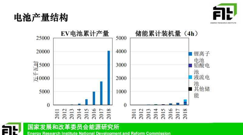 再來看一下就是電池產(chǎn)量的結(jié)構(gòu),這個圖其實想說明一個問題就是實際上目前這個電動化儲能更大一部分來自電動汽車,總的累計的電池的產(chǎn)量的一個統(tǒng)計,到2018年,總的這個電動汽車的動力電池它的累計的產(chǎn)量已經(jīng)大約達(dá)到2億千瓦時這個規(guī)模,這個就是固定式儲能的統(tǒng)計,除了鋰離子電池之外也涵蓋了一些其他的典型的電池,包括鉛酸這些的,總的裝機(jī)規(guī)模大約是1G瓦,也就是四百萬千瓦時這樣的規(guī)模。所以相比于這個動力電池的市場規(guī)模來講的話是非常小的,大約也就是2%的這樣的規(guī)模。總體來講的話,電動汽車這樣的數(shù)量規(guī)模推動了整體電池成本下降,如果電動汽車本身作為一個儲能的單元,來參與到整體的這個電力系統(tǒng)儲能來講的話,它會產(chǎn)生非常重要的戰(zhàn)略的價值,比如說我們這個圖里面把這個電動汽車和可再生能源之間進(jìn)行了一個聯(lián)系,可以幫助我們上游吸納更多的可再生能源,反過來新能源越來越多之后,里面有更多的新能源占比,可以解決目前電動汽車的爭議,中國大量還是媒電,排放水平是逐步的降低??傮w來講他們之間的協(xié)作,通過儲能這種方式產(chǎn)生這樣的互動協(xié)作可以解決各自在發(fā)展過程當(dāng)中面臨的關(guān)鍵的問題。