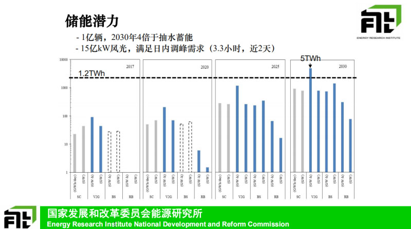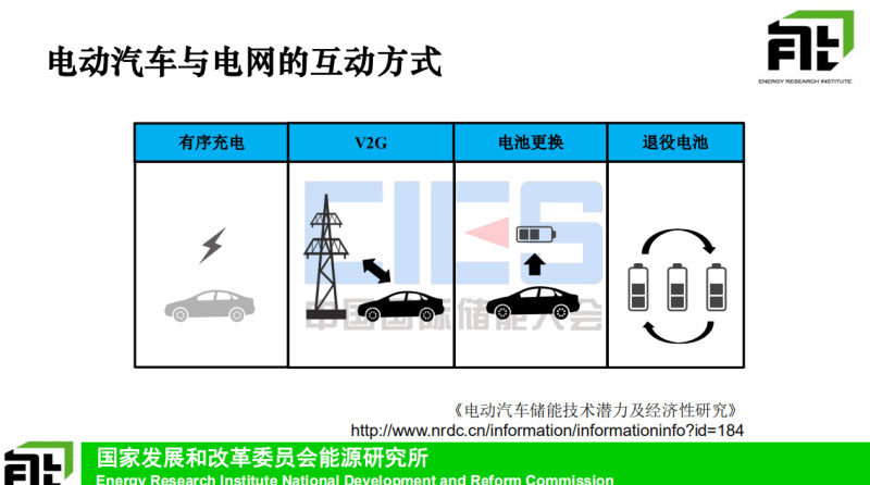 我們這里大致看一下就是電動汽車與電網(wǎng)互動的幾種典型的模式,電池更換還有這個第一類稍微有點不同,是一個單向的通過調(diào)節(jié)充電時間,去實現(xiàn)虛擬儲能的作用,后面幾種是電動汽車跟電網(wǎng)雙向驅(qū)動的模式,這個大家比較了解,不具體說了,這也是我們可能兩年前做的一個研究的,就是假設(shè)2030年有一億輛電動汽車的規(guī)模,來評估幾種儲能方式,總的儲能的這樣能力。通過V2G這樣來講的話,可以提供5T瓦時的儲能能力這樣的規(guī)模的話差不多就是4倍這樣的規(guī)模,按照8小時的放電時間,1.5億千瓦的這種資源去評估的。