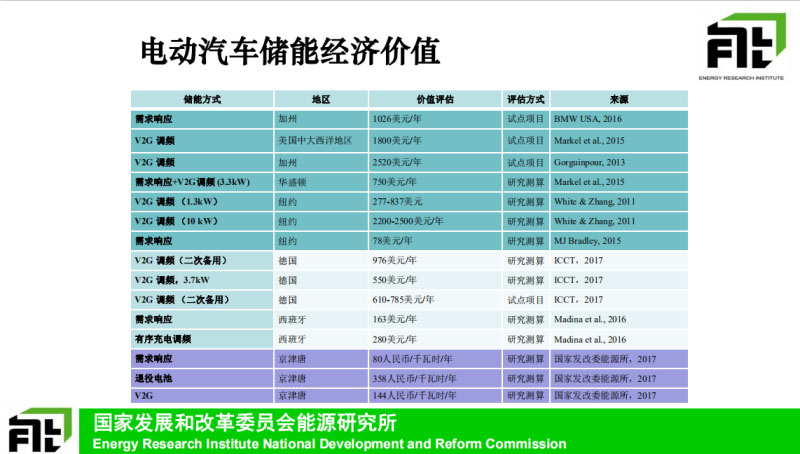 剛剛說的是一個技術(shù)潛力這個問題,再看一下電動汽車儲能的經(jīng)濟(jì)的這個問題,這個國外研究比較多,收集了相關(guān)的一些研究成果,上面幾類在德國美國歐洲的一些國家,他們所做的案例的研究,有部分試點項目,有一部分就是研究的一個結(jié)果,總的來講的話,我們看到如果電動汽車可以去參與一些比如說像調(diào)頻這種服務(wù)的話,它其實產(chǎn)生的這樣的價值還是非常高的,差不多每年可以超過兩千,就是比較高的情況下可以超過兩千美元。國內(nèi)也有一些案例研究,總的來講的話就是如果我們最后的歸類來講的話,電動汽車可以實現(xiàn)跟電網(wǎng)更多的分離,比如說可以把電池跟車運(yùn)行可以結(jié)合的話,它的價值會更高一些,如果使用車載電池的話,V2G相對來說更低一些,采用這種單向的調(diào)節(jié)的話,它的價值可能又會更低一些,總體來講的話這樣的規(guī)律,高中低這樣的價值的排列,跟國外的情況也有比較相似的地方。