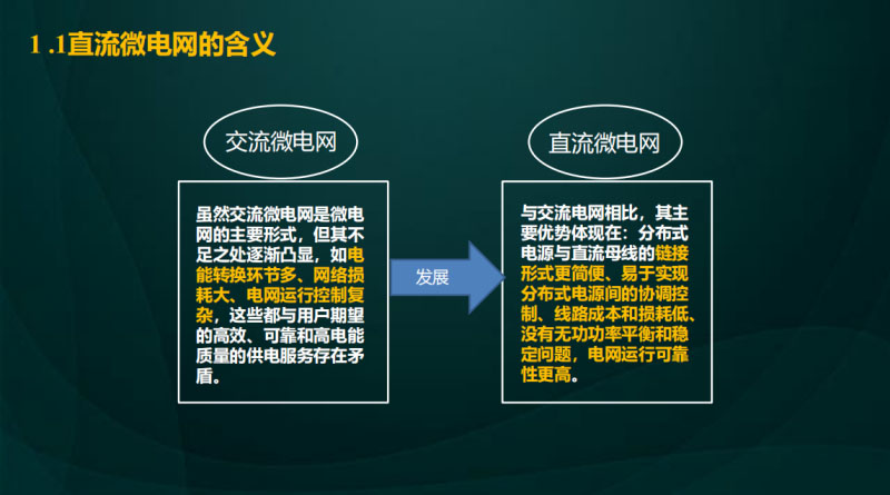 為什么會(huì)提到這樣的概念呢?我們知道傳統(tǒng)的交流微電網(wǎng),雖然是目前的主要形式,但是還是面臨很多問題,比如說(shuō)現(xiàn)在的電能轉(zhuǎn)換環(huán)節(jié)非常的多,像光伏儲(chǔ)能都需要通過(guò)DCAC進(jìn)行能量轉(zhuǎn)換,所以它的損耗比較大的,網(wǎng)絡(luò)損耗也是比較大,控制也是比較復(fù)雜的。相對(duì)于交流微電網(wǎng),我們認(rèn)為通過(guò)直流母線將分布式電源連接在一起這樣的形式更加簡(jiǎn)單,易于控制,線路損耗更低,而且沒有功角穩(wěn)定性的問題,可靠性更高,這也是將研究的焦點(diǎn)從交流微電網(wǎng)轉(zhuǎn)向直流微電網(wǎng)的原因之一。
