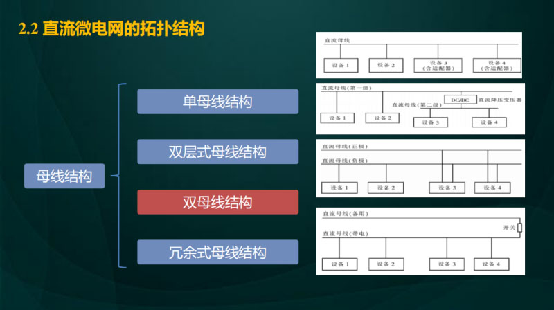 第一個(gè),是電壓等級(jí),我們知道因?yàn)橹绷魇且粋€(gè)全新的系統(tǒng),事實(shí)上目前也就在數(shù)據(jù)中心以及艦船航天等等領(lǐng)域有直流的配電網(wǎng)絡(luò)的應(yīng)用,實(shí)際上在IEC國(guó)際標(biāo)準(zhǔn)里面,沒有關(guān)于直流電壓等級(jí)的定義,這也是我們工作組目前所承擔(dān)的一項(xiàng)標(biāo)準(zhǔn)化工作,就是關(guān)于我們未來(lái)這個(gè)怎么去定義一個(gè)直流微電網(wǎng)當(dāng)中的電壓等級(jí),關(guān)于這個(gè)電壓直流選取要考慮幾個(gè)原則:第一個(gè),配電的容量,包括供電的距離以及供電的容量;第二個(gè),考慮和現(xiàn)有設(shè)備的兼容性和通用性,比如說(shuō)現(xiàn)在在交流系統(tǒng)當(dāng)中用到的模塊以及這種電容器,他們現(xiàn)在已經(jīng)形成了規(guī)模化的產(chǎn)品,未來(lái)定義的這個(gè)電壓等級(jí),能否兼容現(xiàn)有產(chǎn)品是非常重要考慮的點(diǎn);第三個(gè),與現(xiàn)有交流設(shè)備的融合,怎樣使交流設(shè)備以最小的成本經(jīng)過(guò)改造后接入直流系統(tǒng),這也是考慮的重點(diǎn)之一;第四個(gè)就是安全性,因?yàn)閷?duì)于普通的用戶來(lái)說(shuō),他并不關(guān)心這個(gè)用的到底是交流電還是直流電,因此用電安全需要重新做一個(gè)考慮;第五個(gè)就是應(yīng)用場(chǎng)景,直流的控制非常靈活,可能涉及到的場(chǎng)景也許會(huì)比交流會(huì)更加的豐富,或者更容易實(shí)現(xiàn)。這是荷蘭的專家針對(duì)從12V一直到1500V,不同應(yīng)用場(chǎng)景下對(duì)應(yīng)的電壓等級(jí)以及應(yīng)用進(jìn)行了匯總。第二塊,是直流拓?fù)?,本質(zhì)上和交流沒有太多的區(qū)別,按照母線結(jié)構(gòu)來(lái)說(shuō)的話,主要分成單母線結(jié)構(gòu),還有雙層式母線結(jié)構(gòu),直流會(huì)出現(xiàn)雙母線結(jié)構(gòu),這是單極的供電方式,這是雙極的供電方式,第三個(gè)圖是對(duì)稱的單極接線。