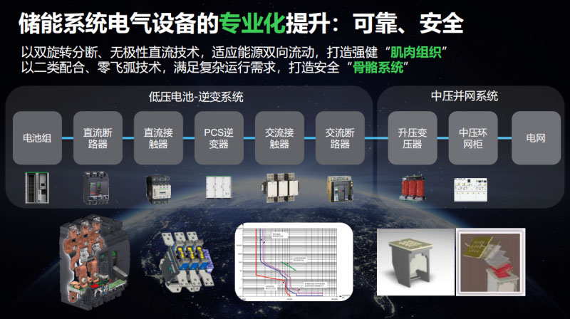 先看一下施耐德所倡導(dǎo)的三重架構(gòu),從底端的互聯(lián)互通的設(shè)備來實(shí)現(xiàn)現(xiàn)場(chǎng)級(jí)別的快速有效的運(yùn)維,到云端實(shí)現(xiàn)對(duì)整個(gè)系統(tǒng),全生命周期的資產(chǎn)的管理還有優(yōu)化,通過這種開放,兼容的三層架構(gòu)在儲(chǔ)能系統(tǒng),在新能源系統(tǒng)達(dá)到一個(gè)最優(yōu)的管理平衡。首先第一個(gè)主題就是我們剛剛說的如何來提升全生命周期整個(gè)電力系統(tǒng)的可靠性。把一個(gè)電力系統(tǒng)打開之后可能有低壓配電系統(tǒng)還有中壓配電系統(tǒng),構(gòu)成安全性可靠性的很重要的一點(diǎn)。對(duì)整個(gè)電力系統(tǒng)來說是整個(gè)在儲(chǔ)能系統(tǒng)當(dāng)中受環(huán)境影響性比較大,相對(duì)來說可能造成的損失不多但是造成的頻次是最高的,看一下從低壓配電到高壓配電,其實(shí)里面可以看到,比較核心的就是說像里面儲(chǔ)能系統(tǒng)電池輸出的,有的時(shí)候用熔斷器保護(hù),相對(duì)來說具有比較穩(wěn)定可靠性的組合方案將比熔斷器更加可靠性。我們知道儲(chǔ)能系統(tǒng)很大的一個(gè)特點(diǎn)在于儲(chǔ)能的流動(dòng)是雙向的,電池側(cè)進(jìn)行充電也有可能由電池側(cè)向電網(wǎng)側(cè)進(jìn)行放電,在選型設(shè)備的時(shí)候,對(duì)里面尤其是直流側(cè)的在使用當(dāng)中的時(shí)候,它里面的核心關(guān)鍵這里面具有一個(gè)直流的極性,在使用當(dāng)中的時(shí)候,必須要滿足要求,最高達(dá)到1500V在進(jìn)行滅弧分段時(shí)會(huì)達(dá)到正常電壓的2000V的檔次,要求這個(gè)元件必須不具有極性,因?yàn)槠胀ǖ墓夥到y(tǒng)大家知道可以光伏的電能量到電直板如何保證元?dú)夂诵募臎]有極性的安裝使用是在選型當(dāng)中一個(gè)關(guān)鍵,打造這種堅(jiān)強(qiáng)的肌肉系統(tǒng)還有骨骼系統(tǒng)的核心。