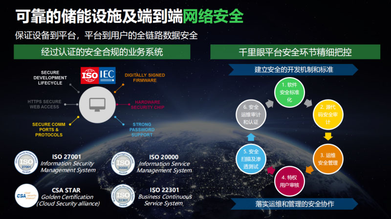 最后說安全,安全是一個(gè)永恒的話題,我們一般很多我們認(rèn)為智能化代表著不安全,因?yàn)橹悄芑赡苓^分的強(qiáng)調(diào)智能化,代表的就是開放性或者可控性會(huì)下降,但是并非如此,這里看到其實(shí)系統(tǒng)安全分為硬件還有軟件兩個(gè)層次,包含數(shù)據(jù)的安全還有應(yīng)用。如果從我們自己打開一個(gè)安全系統(tǒng)來說分兩個(gè)層次,第一個(gè)如何衡量一個(gè)系統(tǒng),或者儲(chǔ)能管理系統(tǒng)是否安全,看它是不是符合標(biāo)準(zhǔn),比如說這里面全部的國(guó)際標(biāo)準(zhǔn),看一個(gè)比較重點(diǎn)的ISO27001,它所實(shí)現(xiàn)的關(guān)鍵的管理系統(tǒng),對(duì)系統(tǒng)進(jìn)行認(rèn)證,是一個(gè)體系認(rèn)證,ISO27001將是一個(gè)很關(guān)鍵的因素。現(xiàn)在成為國(guó)際標(biāo)準(zhǔn),修改過了若干版,這一系列角度對(duì)信息系統(tǒng)提出安全。從軟件的標(biāo)準(zhǔn)化代碼的安全性到特權(quán)審核,才能保證從內(nèi)部,所以說施耐德的安全系統(tǒng),尤其是電力管理的系統(tǒng),內(nèi)部的時(shí)候有非常強(qiáng)的內(nèi)控性,保證用戶在使用當(dāng)中的時(shí)候不會(huì)出現(xiàn)兩大問題,一個(gè)問題是信息的損失還有信息的丟失。這邊不多說,因?yàn)閮?chǔ)能系統(tǒng)對(duì)我們來說大家非常專業(yè),可以回顧看到在底層的神經(jīng)元還有肌肉骨骼到云端的全系列管理,可以實(shí)現(xiàn)在儲(chǔ)能挑戰(zhàn)的時(shí)候最優(yōu)化的設(shè)計(jì)。