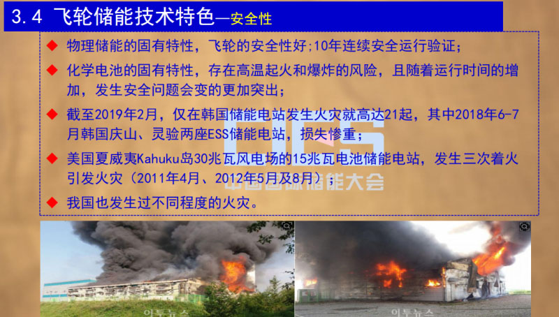 第二個(gè)特點(diǎn),飛輪儲(chǔ)能的安全性,它是一種機(jī)械儲(chǔ)能,固有特性就是安全性比較好。在美國(guó)飛輪儲(chǔ)能電網(wǎng)調(diào)頻電站具有連續(xù)十年安全運(yùn)行的驗(yàn)證。相對(duì)于化學(xué)電池,有燃燒和爆炸的風(fēng)險(xiǎn),而且,隨著運(yùn)行時(shí)間的增長(zhǎng),安全性更加突出。截至2019年2月,韓國(guó)就發(fā)生化學(xué)電池起火事件21起,美國(guó)也出現(xiàn)了2起這種事故,我們國(guó)家也出現(xiàn)過不同程度的化學(xué)電池火災(zāi)問題。
