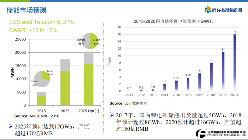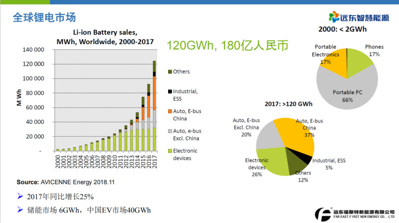 簡單介紹一下整個鋰電池市場的發(fā)展概況。這是全球鋰電池的一個最新數(shù)據(jù)。2017年全球的鋰電池是120GWh。2017年針對動力電池,中國和海外的加起來一共是57%,其他的是數(shù)碼類的,動力電池占到了絕對多數(shù)。這是動力電池的市場預(yù)測。咱們中國數(shù)據(jù)來源,2017年中國電動汽車達(dá)到了120萬量。絕對數(shù)是最多的,但是其實(shí)挪威占比最高,全國電動化率超過6%。我們預(yù)測2030年,中國動力電池電動汽車乘用車、客車、卡車分別達(dá)到26%,歐洲達(dá)到23%。2030年,中國2-3輪車電動化將達(dá)到90%。我想在2020年最后或者2030年全面電動化以后成本就不是特別大的問題。這是我們儲能的預(yù)測,給了兩個圖。一個是海外的預(yù)測,2025年認(rèn)為儲能會做到17GWh。這是一個戶用儲能,現(xiàn)在做得比較多也比較熱。尤其是歐洲或者澳洲。包括日本,基本上一年也在10萬臺到20萬臺。產(chǎn)值應(yīng)該在二三十億。