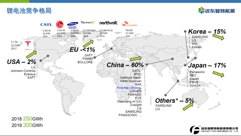 其實(shí)這是中汽協(xié)的研究數(shù)據(jù)。我們主要做乘用車,會達(dá)到5GWh的退役,正級材料將近10萬噸。我們先在儲能電站做一次應(yīng)用,最后再做到材料回收。這是整個鋰電池全球的競爭格局??梢钥匆幌轮袊剂巳虻?0%。歐洲這一塊對我們來說是一個很大的市場。歐洲用電池特別多,歐洲的電池廠只有1%不到。預(yù)計(jì)2018年去年整個全球的動力電池的產(chǎn)能是250GWh。2019年預(yù)計(jì)300GWh。關(guān)于儲能政策這幾年都是利好的,2019年,國家能源局這個級別的政策應(yīng)該有超過18個。這是動力電池3月26號出的動力電池的補(bǔ)貼政策,包括能耗包括密度,現(xiàn)在出來以后,250公里以下的車是沒有補(bǔ)貼的。要么就是400公里的要么就是250-400公里的才有補(bǔ)貼。能量密度只需要160Wh/kg就可以了。2019年之前的動力電池政策賣給汽車廠的電池包,基本上國補(bǔ)和地補(bǔ)能達(dá)到。但是現(xiàn)在地補(bǔ)沒有了,國補(bǔ)減半。這一塊對動力電池的刺激比較大。