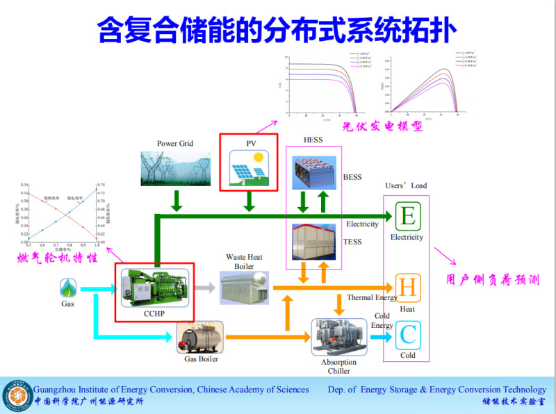 下面介紹我們在最優(yōu)化控制方面做的一些工作。大家看這是一套傳統(tǒng)的分布式能源系統(tǒng)。比如是用燃氣發(fā)電技術(shù)發(fā)電,同時,電不足的時候用網(wǎng)電來補充、熱能不足的時候用燃氣鍋爐來補充。這個系統(tǒng)特點是沒有可再生能源發(fā)電系統(tǒng),沒有儲能系統(tǒng)。燃氣基礎(chǔ)負荷率比較低,能源效率比較低,能源浪費嚴重。把它作一個改造,變成一個含復(fù)合儲能的分布式系統(tǒng)拓撲。對于這個系統(tǒng),我們有三個已知參數(shù):一個是可以預(yù)測的用戶側(cè)負荷以及光伏發(fā)電,另外包括燃氣機組的運行特性。有了這些以后,可以定出一些改進的運行策略。這張PPT顯示的就是我們設(shè)計的改進型以電定熱控制策略。電首先要把光伏發(fā)電全部用完。下一個級別就是燃氣機組。熱就是首先要利用燃氣機組的熱能,通過儲能系統(tǒng)來調(diào)節(jié)。系統(tǒng)的熱量供應(yīng)優(yōu)先順序是燃氣機組、儲熱系統(tǒng)、燃料鍋爐。這是分布式系統(tǒng)能量控制判據(jù)及儲能系統(tǒng)容量配置規(guī)則。右邊給出了怎么了確定儲冷儲熱的控制方法。下面這個圖分別是不同季節(jié)的能量分配情況,一個夏季,一個冬季。這是采用100Kw燃氣機組的對比情況。下面這兩個圖分別是傳統(tǒng)的控制策略,上面兩個圖是采用復(fù)合儲能以后的控制策略??梢钥闯觯翰捎脧?fù)合儲能系統(tǒng)進行調(diào)控,冬季工況下仍然存在熱能損失,但是損失量有所減少。夏季工況下100Kw燃氣機組運行工況較為穩(wěn)定,但負載率不高、儲電系統(tǒng)沒有起作用;儲熱系統(tǒng)作用明顯,減少了機組的啟停運行。