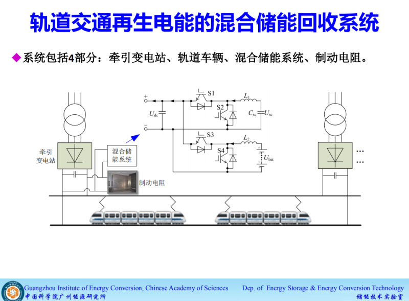 下面我給大家介紹一下我們做的一個超級電容和電池混合儲電的仿真平臺。我們是以軌道交通來做的。大家知道軌道交通比如地鐵往前跑的是電動機帶著車在跑,剎車的時候電動機反轉(zhuǎn)變成發(fā)電機,產(chǎn)生電能并回饋到直流母線。不同于電阻制動消耗能量的方式,我們采用儲能系統(tǒng)把這個電能回收,等下一趟車往前跑的時候就把它用了,再生電能得到了充分利用。左邊是用鋰電池的,右下角是用超級電容的。單一類型儲能介質(zhì)難以在性能、價格、效率等多方面滿足系統(tǒng)能量調(diào)控的作用。通過我們研發(fā)的基于混合儲電的再生電能物理仿真平臺,可以結(jié)合各種智能算法,對單目標、多目標不同運行目標下的混合儲電系統(tǒng)容量設(shè)計、功率分配策略進行驗證和優(yōu)化,有效提高系統(tǒng)運行的經(jīng)濟性、節(jié)能性等指標,從而指導實際系統(tǒng)的設(shè)計和運行。謝謝大家!