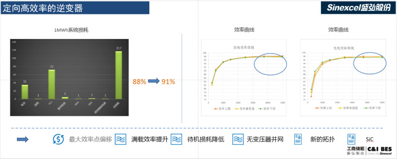 第一、儲能逆變器PCS,PCS的未來發(fā)展我們起個名字叫“定向高效率的儲能逆變器”,什么叫定向高效率呢?是比照之前我們做光伏逆變器或者做變頻做的事情,以前的光伏逆變器我們宣稱的效率基本上是最大的效率,無論是99%也好,還是UPS的96%也好。而到了儲能以后更多的是能量效率,峰值效率意義不大了。下方左圖可以看出來,1兆瓦的儲能系統(tǒng),逆變器損耗的占比是很大的,未來的儲能逆變器朝著定向高效率,滿載效率一定要高,以后PCS可能就是滿載效率,二是空載損耗降到足夠低,才能使系統(tǒng)運行綜合的能量效率最高。采用的技術(shù),未來會采取新的電路拓撲和新的器件碳化硅,也在探討一些用戶側(cè)的儲能項目上把變壓器去掉,綜合提升一個定向的效率,這是未來PCS的一個發(fā)展方向。