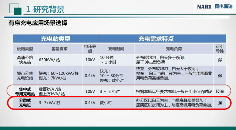 南瑞公司在有序充電方面做了大量的前期調(diào)研工作,這個(gè)是有序充電場(chǎng)景研究的一個(gè)調(diào)研情況表,按照充電設(shè)備類型來進(jìn)行分類的。按照目前的充電設(shè)備可以劃分為:高速路快速充電站、城市快速充電站、城市專用充電站和分散式充電樁。高速公路還有城市的快充站,主要目的是快速補(bǔ)充電能,時(shí)間越短越好,對(duì)于有序充電的引導(dǎo)性比較弱,沒有時(shí)間進(jìn)行引導(dǎo)。對(duì)于集中式的專用充電站,例如公交充電站,公交公司對(duì)充電價(jià)格還是比較敏感的,他們一般的充電規(guī)律是在夜間進(jìn)行主要充電,白天利用??空具M(jìn)行快速的電能補(bǔ)充,所以它的引導(dǎo)性相較前兩者要強(qiáng)。最后,分散充電樁主要指的是在小區(qū)或者是單位/公司停車場(chǎng)部署的交流充電樁,一般車輛停車時(shí)間比較長,對(duì)用車迫切度也不是很高,有序可引導(dǎo)性也是最強(qiáng)的,這也是我們研究的主要場(chǎng)景。