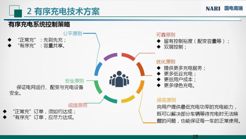 正常充電跟有序充電的區(qū)別,正常充電用戶對(duì)充電價(jià)格并不敏感,對(duì)時(shí)間要求是比較高的;有序充電是用戶有充裕的充電時(shí)間,對(duì)充電價(jià)格有一定的要求,對(duì)100%充滿并不是特別關(guān)注。這張圖是策略執(zhí)行的執(zhí)行架構(gòu),平臺(tái)控制策略負(fù)責(zé)負(fù)荷曲線的預(yù)測(cè),宏觀的調(diào)控;能源控制器負(fù)責(zé)本地的控制策略,實(shí)現(xiàn)臺(tái)區(qū)下的負(fù)荷微觀調(diào)控、精準(zhǔn)調(diào)控和實(shí)時(shí)調(diào)控。能源路由器和充電樁是作為執(zhí)行端來執(zhí)行上端下發(fā)的控制策略。安全方面和經(jīng)濟(jì)方面是控制策略主要因素,安全方面有臺(tái)區(qū)的越限、三相不平衡等因素;經(jīng)濟(jì)方面有峰谷電價(jià)、新能源消納等因素。