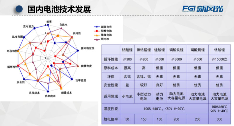 我這幅圖針對(duì)超級(jí)電容還有鋰電池它的14個(gè)指標(biāo)做了一個(gè)分析,我們可以看到的就是超級(jí)電容藍(lán)色的那個(gè)在八九個(gè)點(diǎn)上面得分比較高的,鋰電池雖然在自放電、還有實(shí)用性和能量密度上面都有比較好的評(píng)分,但是有幾個(gè)安全性的問題,它的得分并不高。根據(jù)我們電站的作用不同選擇不同的儲(chǔ)能介質(zhì),在整個(gè)儲(chǔ)能建設(shè)過(guò)程當(dāng)中需要考慮的問題,是電能容量的要求,還是快速響應(yīng)儲(chǔ)能容量的要求,選擇的介質(zhì)是完全不一樣的。在這里說(shuō)了一個(gè)電解電容它的充電能力還有充放電率做了一個(gè)比較,還有就是鋰電池在這里面從它的循環(huán)性,適用領(lǐng)域做了一個(gè)對(duì)比。所以現(xiàn)在來(lái)看的話,大家選擇比較多的就是碳酸鋰電池,還有硫酸鋰電池,在做儲(chǔ)能的時(shí)候,它在選擇的時(shí)候,成本有的時(shí)候會(huì)考慮的比較多。