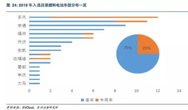 2018年發(fā)布的6-12批新能源汽車推薦目錄中,燃料電池汽車共有72款車型入選,其中客車54款,占比達到75%。2018年入選的車型中,燃料電池系統(tǒng)額定功率達到30-40kw的車型有45款,達到40-50kw的車型有13款,50kw以上的車型有14款。目前國內(nèi)燃料電池水平總體與國外差距較大,日本的燃料電池車型額定功率基本在120-200kw。