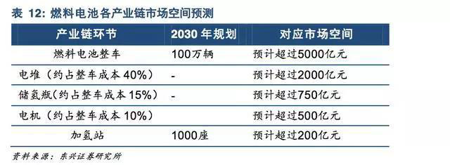 國內(nèi)2030年燃料電池汽車商業(yè)推廣計劃超過100萬輛,預(yù)計對應(yīng)市場空間超過5000億元。按照電堆成本占比40%,儲氫瓶成本占比15%,電機成本占比10%計算,預(yù)計2030年國內(nèi)燃料電池電堆、儲氫瓶、電機對應(yīng)市場空間分別超過2000億元、750億元和500億元。