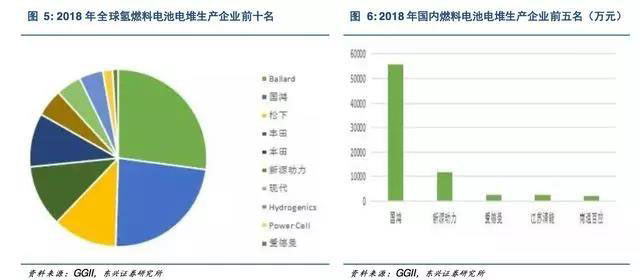 根據(jù)高工產(chǎn)研氫電研究所的數(shù)據(jù),2018年氫燃料電池領(lǐng)軍企業(yè)分別為巴拉德、國鴻氫能、松下、豐田、本田??紤]到國鴻氫能主要為引進巴拉德的技術(shù)路線,巴拉德及其相關(guān)公司占全球燃料電池電堆生產(chǎn)的主流。