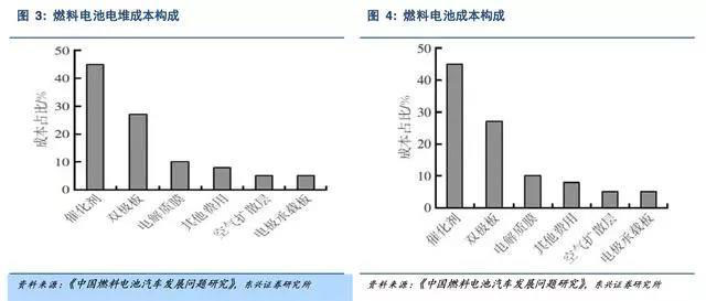 根據(jù)美國能源部(DepartmentofEnergy,DOE)對燃料電池汽車的成本的系統(tǒng)分析,目前電堆及儲氫瓶成本仍為燃料電池汽車的主要成本構(gòu)成。電堆成本當中,催化劑、雙基板、電解質(zhì)膜是主要的成本來源。