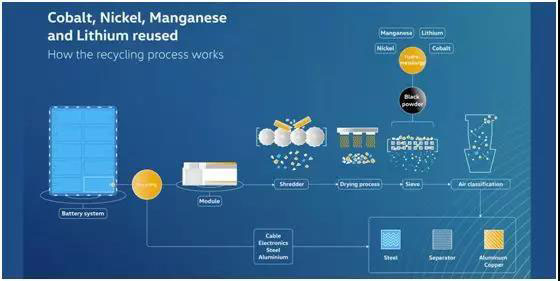 大眾汽車將回收的電池加以分析和分類,對于未達到使用壽命的電池,會在移動充電站等地方進行二次使用,類似于用電池組為手機充電。若電池無法再利用,將被粉碎,研磨成粉末,這樣一來,其中有價值和稀有的原材料,如鋰、鈷、錳和鎳等可得到提取和分揀,以便生產(chǎn)新電池。