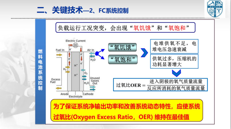 第二個(gè)關(guān)鍵技術(shù),就是燃料電池系統(tǒng)控制。大家知道,豐田的大巴和乘用車,混合動(dòng)力系統(tǒng)拓?fù)浜涂刂贫际遣灰粯拥?,就是因?yàn)閮烧吖r不一樣。軌道交通的工況,完全不同于汽車,在數(shù)秒內(nèi)會(huì)出現(xiàn)上千安的電流波動(dòng),即使有儲(chǔ)能來跟蹤負(fù)荷變化,但母線電壓仍然會(huì)出現(xiàn)劇烈波動(dòng),對(duì)燃料電池的影響是非常大的。因此,軌道交通燃料電池系統(tǒng)控制,非常重要。對(duì)此,我們有十年左右的研究。燃料電池系統(tǒng)控制,主要關(guān)注四個(gè)控制目標(biāo),那就是滿足負(fù)載功率的需求、提高效率、延長(zhǎng)壽命,在許可的情況下盡量提高它的響應(yīng)速度。影響這四大目標(biāo)的影響因素,包括溫度、壓力、濕度、還有氣體和汽液的動(dòng)態(tài)時(shí)空分布。結(jié)合軌道交通工況,怎么樣開展燃料系統(tǒng)的控制,使得上面的多物理場(chǎng)多時(shí)空尺度的均衡分布,滿足四大目標(biāo)的實(shí)現(xiàn),這是我們關(guān)心的問題。