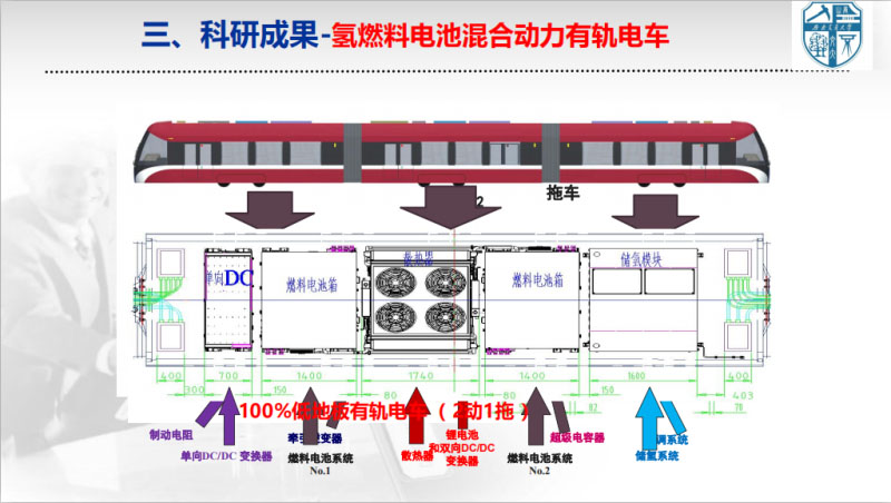 下面匯報(bào)一下我們的研究成果。我們主要針對(duì)燃料電池、動(dòng)力電池在軌道交通方面的工作。我們的項(xiàng)目,從國家到部級(jí)到省級(jí),都是燃料電池和軌道交通方面相關(guān)的。這是2013年我們團(tuán)隊(duì)研制的國內(nèi)首輛燃料電池電動(dòng)調(diào)車機(jī)車,采用的是地鐵實(shí)際在用的調(diào)車。這個(gè)就是2016年4月份做的一個(gè)燃料電池混合動(dòng)力的有軌電車。上面這是樣車研制時(shí)候的樣子。現(xiàn)在這個(gè)車放在唐山,就是下面這個(gè)圖,刷成紅色了,想作為唐山的工業(yè)旅游線路的交通工具?,F(xiàn)在這個(gè)車準(zhǔn)備再開展為期兩年的運(yùn)行。一直在做這種試驗(yàn)測(cè)試工作。這是當(dāng)時(shí)我們這個(gè)車儲(chǔ)能還有燃料電池系統(tǒng)的布局。這是當(dāng)時(shí)這個(gè)車出來的時(shí)候的視頻。