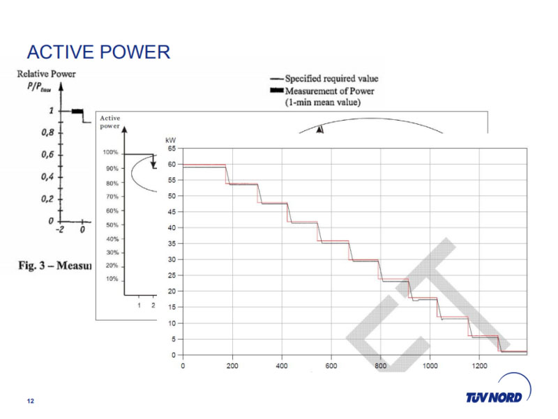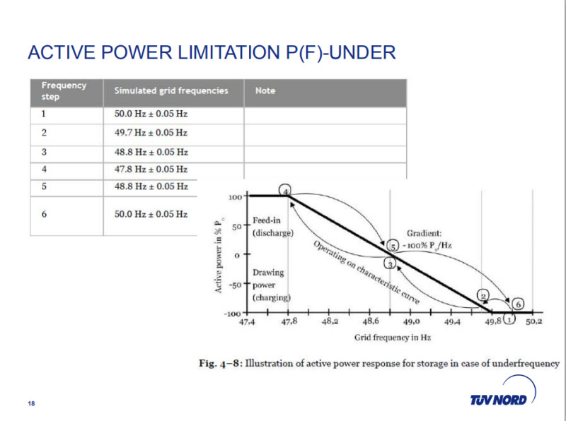 舉個例子,比如說你是頻率過了到了51.5赫茲,你通過這個公式可以計算出來德爾塔P,意思就是說功率這塊要改變多少,算出來大概52%,針對52%這個值的要求,會要求你在2秒之內(nèi)先達到變化值50%,然后剩下的20秒內(nèi)達到完完全全的電網(wǎng)需要的功率的變化值。針對于以前的標準或者說廠家的研發(fā)設(shè)計,通常的廠家這的值的變化是用一個瞬變的方式,就是說我前兩面可能是51.5赫茲,我的P可能5%或者10%,下一秒我增加到6.2%,我的廠家可能一下子漸變到62%了,現(xiàn)在德國電網(wǎng)標準的要求是,我要沿著這條線,就是說完全符合這條線的斜率上去,就是說我哪怕精確到每1秒或者每1毫秒或者每10毫秒,我都是愛覆蓋在這條線上面的,而不是說一個瞬變的過程。
