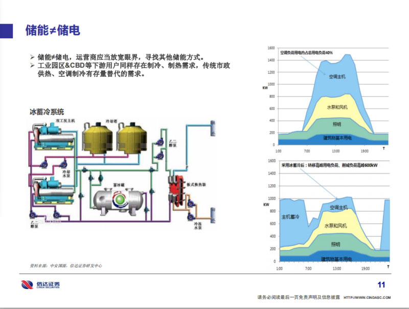 從這個(gè)角度來(lái)說(shuō),所以我們覺得說(shuō)儲(chǔ)能的這個(gè)行業(yè)其實(shí)對(duì)自身有一個(gè)比較好的定位下我們覺得說(shuō)其實(shí)如果是從運(yùn)營(yíng)商的角度來(lái)說(shuō),其實(shí)它應(yīng)該是做服務(wù),綜合能源服務(wù)其實(shí)是儲(chǔ)能發(fā)展的一個(gè)終極目標(biāo)。為什么這么說(shuō)呢?因?yàn)槲矣X得大家應(yīng)該不應(yīng)該把目光局限在儲(chǔ)電上面,綜合能源服務(wù)一個(gè)是在觸電本身的領(lǐng)域下面要做更深入細(xì)致的一些工作,另外,它不應(yīng)該僅僅局限于儲(chǔ)電,比方說(shuō)像冷熱這種形式也應(yīng)該考慮在內(nèi)的,最簡(jiǎn)單來(lái)說(shuō),儲(chǔ)能不代表是儲(chǔ)電,我覺得身為一個(gè)儲(chǔ)能按的運(yùn)營(yíng)商思路要打開,尋找其他儲(chǔ)能方式。比如在大的工業(yè)園區(qū)或者CBD的園區(qū)內(nèi),對(duì)于下游的用戶其實(shí)是存在一個(gè)制冷、制熱的需求。傳統(tǒng)我們制冷、制熱,制熱可能是市政供暖,制冷是空調(diào)的模式,空調(diào)的制冷負(fù)荷可能占40%,但是如果我們采用冰蓄冷的,可能技術(shù)都不需要太先進(jìn),因?yàn)閮?chǔ)熱的這種模式,從上游技術(shù)角度來(lái)說(shuō)有很多種,但是采用冰蓄冷的模式效果也是很好的。白天的時(shí)候進(jìn)行供熱,假設(shè)我們有一個(gè)比方說(shuō)這樣的案例,21萬(wàn)平米的供暖面積,這個(gè)是針對(duì)比方說(shuō)居民用戶的或者一般工商業(yè)用戶的,它的建設(shè)費(fèi)用包括折舊費(fèi)用和中間材料運(yùn)營(yíng)的費(fèi)用,總體算下來(lái)可能只有19元/平米,其實(shí)如果對(duì)應(yīng)到我們現(xiàn)在采暖的價(jià)格的話,其實(shí)還是有一定的競(jìng)爭(zhēng)力的。
