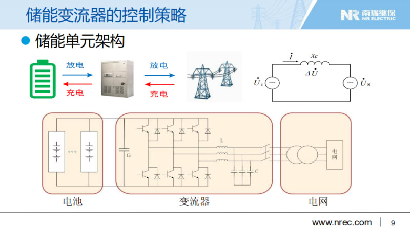 第二部分,介紹一下儲(chǔ)能有這么多好處,沒(méi)有實(shí)現(xiàn),但是有很多工作可以做。從技術(shù)方面還有哪些工作可以做呢??jī)?chǔ)能變流器首先有自身的控制策略,儲(chǔ)能有整個(gè)系統(tǒng)的控制模式。先看看儲(chǔ)能變流器本身有哪些控制策略。第一個(gè)是儲(chǔ)能單元架構(gòu),大家都很清楚。這可以等效于右上角的模型,它跟電網(wǎng)之間通過(guò)連接阻抗聯(lián)系在一起。儲(chǔ)能系統(tǒng)與電網(wǎng)交換的有功和無(wú)功功率見(jiàn)表達(dá)式,這個(gè)表達(dá)式里面電網(wǎng)的電壓幅值Us,儲(chǔ)能作為電源的幅值是Uc,兩個(gè)電壓相量的夾角δ,也稱為功角。通過(guò)調(diào)節(jié)變流器輸出的Uc和δ值,可以實(shí)現(xiàn)變流器輸出的有功和無(wú)功雙向可控,它在四象限可以運(yùn)行,調(diào)節(jié)性能非常優(yōu)秀,充分發(fā)揮儲(chǔ)能的調(diào)節(jié)性能。具體如何實(shí)現(xiàn)這樣的調(diào)節(jié)?右下角的圖,Uc是怎么來(lái)的,Uc是控制出來(lái)的。變流器在PWM載波控制下,其輸出幅值及與系統(tǒng)電壓的相位是由控制系統(tǒng)調(diào)節(jié)計(jì)算得到的調(diào)制波決定的。請(qǐng)看控制框圖,最左邊Xd*是某一個(gè)被控目標(biāo)值的給定值,Xd是被控目標(biāo)的測(cè)量值,當(dāng)閉環(huán)控制系統(tǒng)達(dá)到穩(wěn)定平衡的時(shí)候,Xd*就等于Xd,同樣的另外一個(gè)維度,Xq*就等于Xq。假如把目標(biāo)值設(shè)定成有功功率和無(wú)功功率,那么控制系統(tǒng)穩(wěn)定時(shí),儲(chǔ)能系統(tǒng)輸出的有功功率就會(huì)等于有功功率給定值,無(wú)功功率也等于無(wú)功功率的給定值,這時(shí)的控制就稱為PQ模式。當(dāng)Xd和Xq分別為頻率和電壓時(shí),這時(shí)的控制就稱為VF模式這是變流器的一種控制策略。