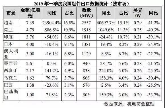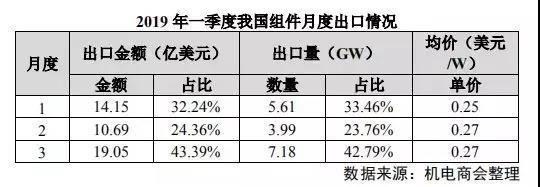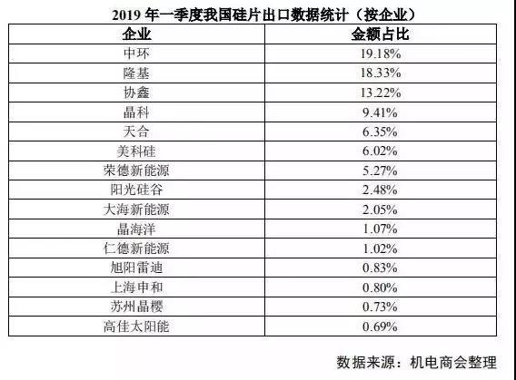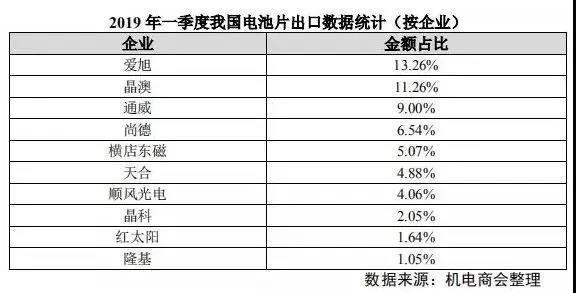 從出口企業(yè)看,2019 年一季度我國(guó)組件出口額前五位企業(yè)分別是晶科、晶澳、天合、阿特斯和隆基,前十二位企業(yè)出口數(shù)量占總出口量的 65%以上。(來(lái)源:中國(guó)機(jī)電產(chǎn)品進(jìn)出口商會(huì))